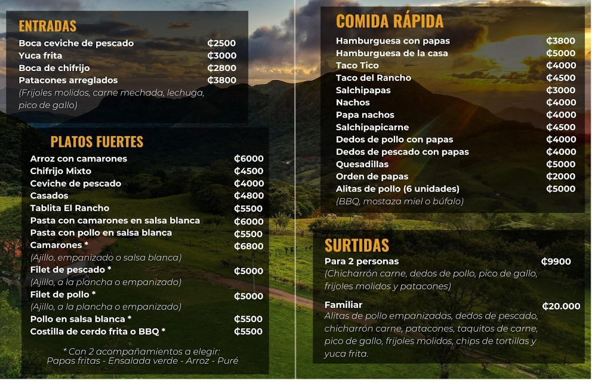 The menu at Bar Restaurante Rancho Solania in Guanacaste Province, Tilarán, Costa Rica offers a delightful mix of local flavors and hearty dishes that showcase the region's culinary heritage. One standout is the Carne Asada, a perfectly grilled steak served with fresh sides like rice, beans, and a tangy salad. This dish is a true reflection of Costa Rican barbecue traditions. For seafood lovers, the Ceviche is a must-try, with its zesty and refreshing combination of fish, lime, and cilantro, making it a great choice for those looking for something light yet flavorful. Another gem on the menu is the Pollo a la Parrilla, a tender grilled chicken dish with a smoky, charred flavor that pairs beautifully with the restaurant's house-made sauces.